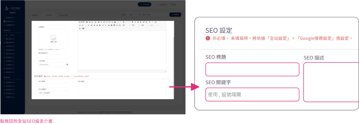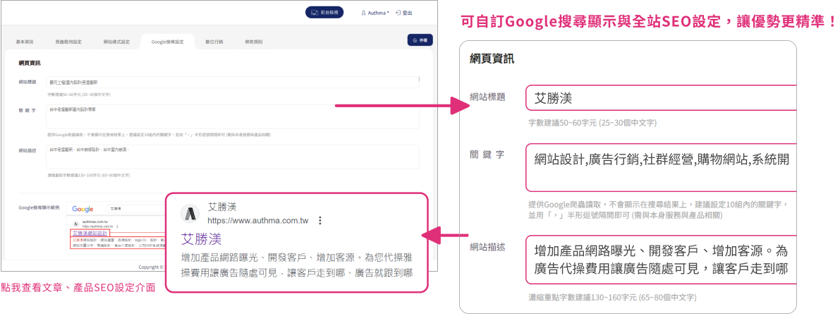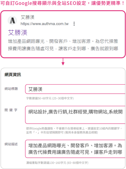 我們的網站提供全面的SEO設定,不僅提升整體表現,還能針對每篇文章和產品進行最佳化,提高搜尋排名和流量!