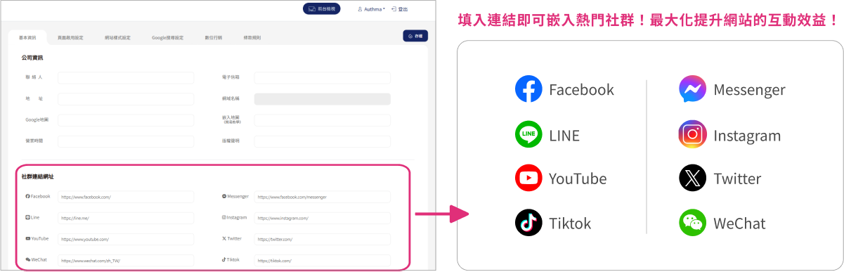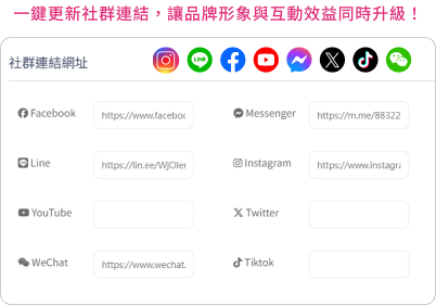 後台具備8大社群連結嵌入功能,修改後可同步更新前台,讓您輕鬆管理連結,保持品牌一致性並最大化互動效益。