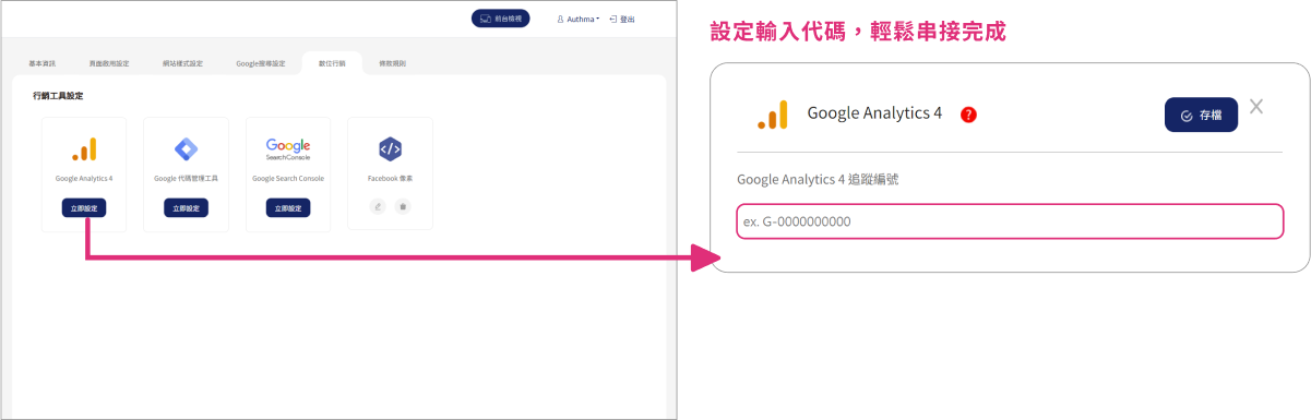 網站後臺可直接輸入行銷工具的追蹤編號(如GA4),無需工程師協助,輕鬆掌握網站流量和成效,助您優化行銷策略。
