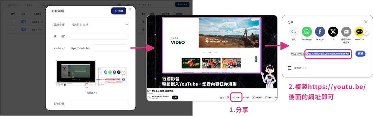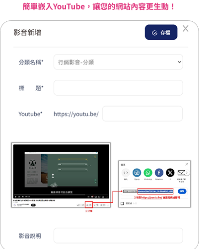 我們的網站支援Youtube影片嵌入功能,您只需複製影片網址即可將影片快速嵌入網站,不僅操作方便,還不會佔用網站空間和流量,確保網站速度不受影響。讓行銷影音更靈活自由,輕鬆規劃您的多媒體內容。