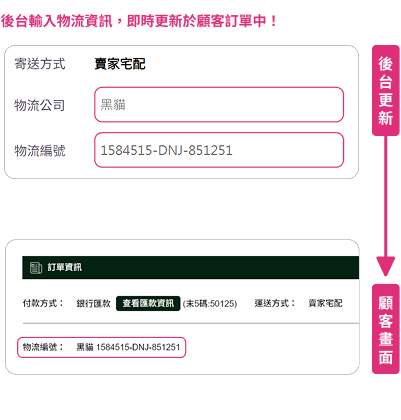 電商後臺系統提供即時資料更新,輕鬆檢視訂單詳情,並可直接回饋客戶物流狀態,讓客戶即時追蹤訂單及物流狀況。