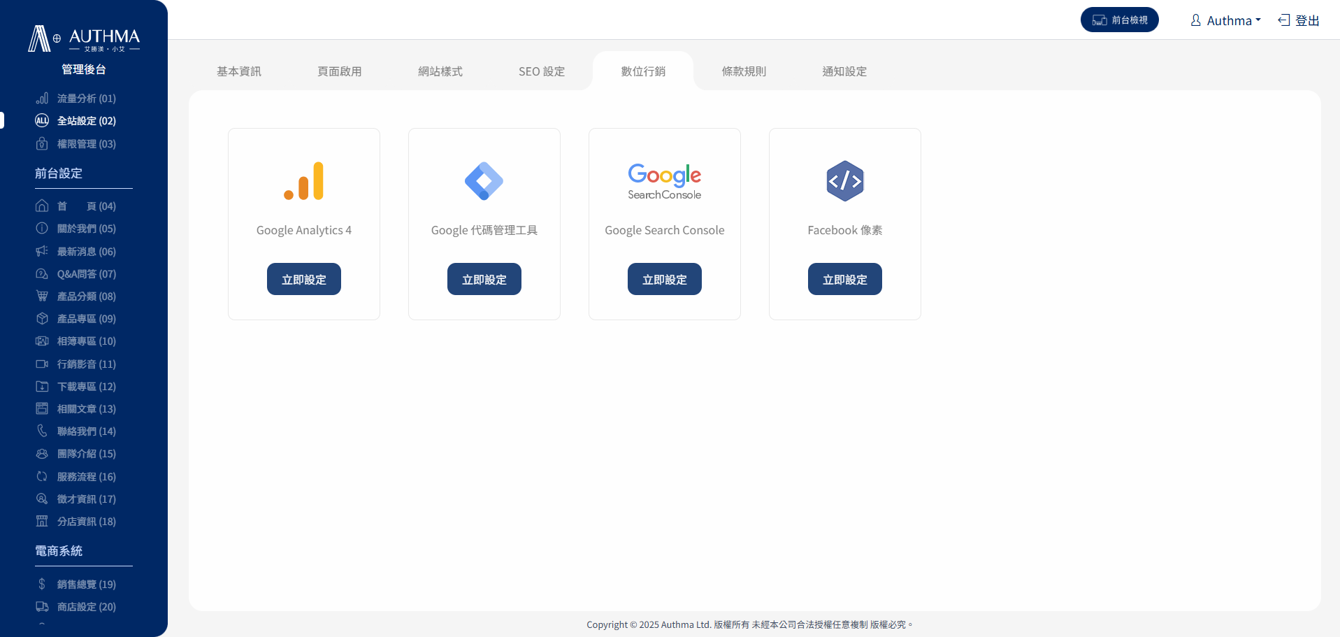 2. 到網站後台 → 「全站設定」→「數位行銷追蹤碼」欄位,貼上測量ID。
