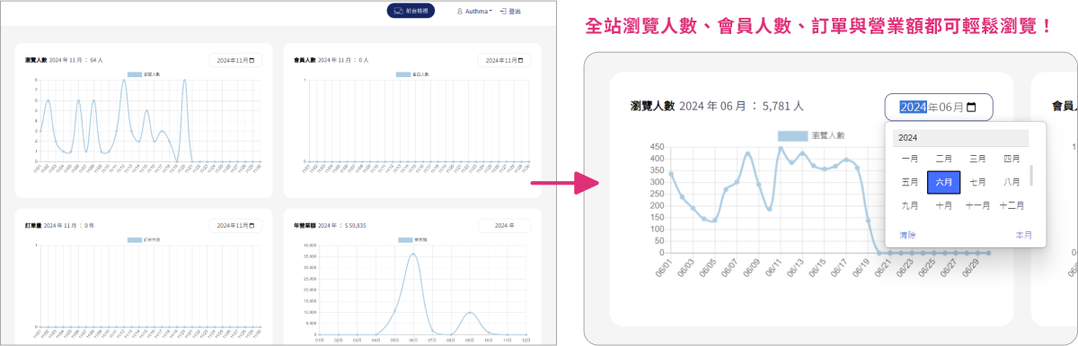 網站後台不僅可以查看全站瀏覽人數、會員人數、訂單與營業額,操作簡便使用體驗佳,讓您能夠即時掌握網站運營情況並識別趨勢,有利於優化營銷策略,提高整體業務績效或適時改變更佳的策略!