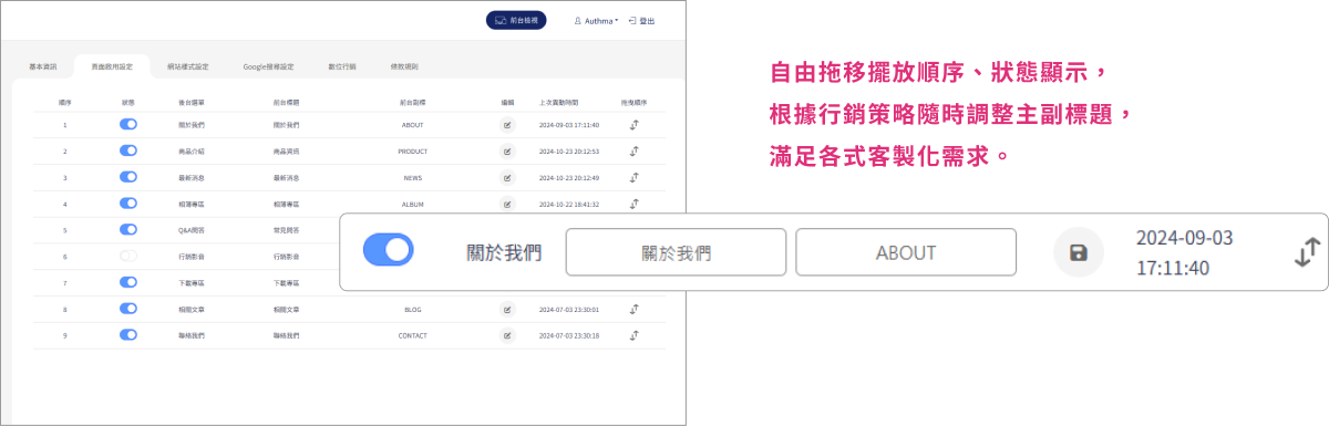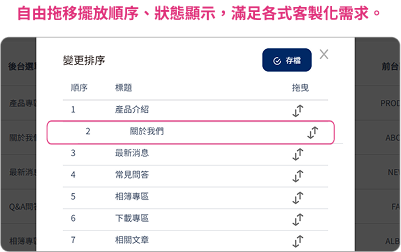頁面設計具備高度自由操作性,包括頁面的自由開關、調整順序,並隨時更改主副標題,以符合當前的營運需求或行銷策略。無需依賴技術人員,輕鬆管理網站,全面滿足企業經營的各個層面需求。
