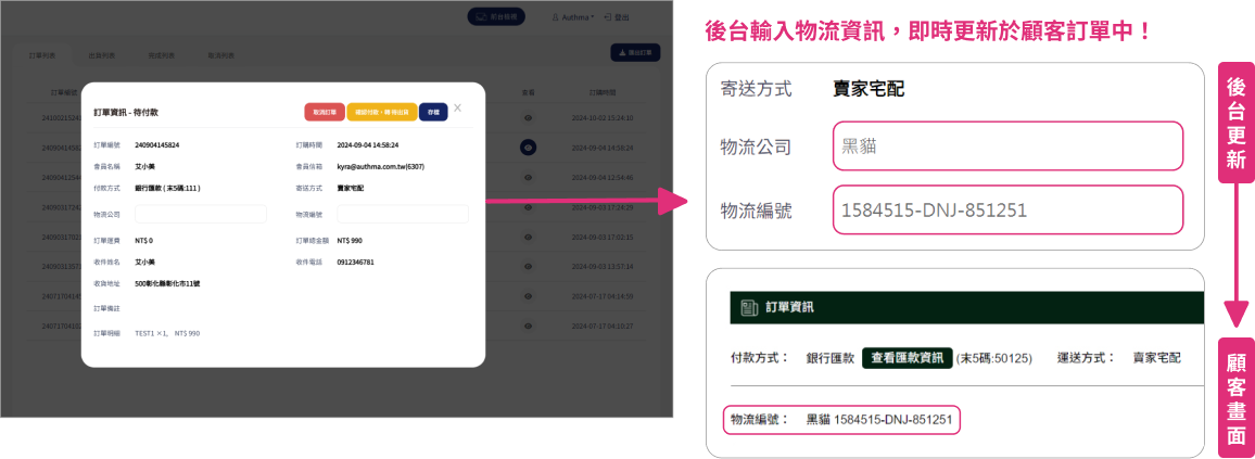 我們的電商後台訂單管理系統,提供即時資料更新與集中管理功能,讓您輕鬆查看每筆訂單詳細資訊。並且您可以於頁面中直接回饋客戶物流狀態與編號、轉換訂單狀態,讓客戶能於前台即時追蹤訂單,與查看物流資訊。
