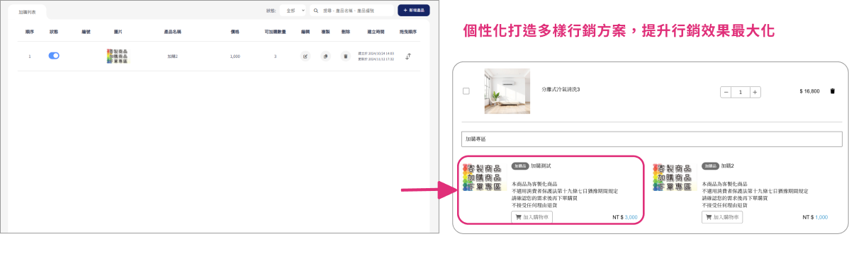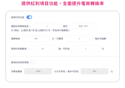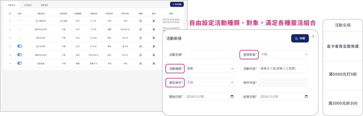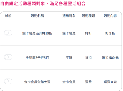 網站支援多元化商店行銷活動,可自由設定對象、活動種類及條件,超多靈活組合認您搭配,滿足各種電商需求!