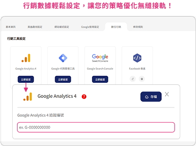 網站後臺可直接輸入行銷工具的追蹤編號(如GA4),無需工程師協助,輕鬆掌握網站流量和成效,助您優化行銷策略。